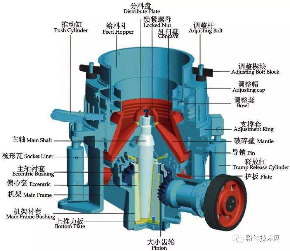弹簧圆锥破碎机主要由机架、定锥总成、动锥总成、弹簧机构、碗型轴架部和传动等部分组成;其辅助部分由电气系统、稀油润滑系统和液压清腔系统组成。圆锥破碎机工作时,由电动机通过三角带、大带轮、传动轴、小锥齿轮、大锥齿轮带动偏心套旋转,破碎圆锥轴心线在偏心轴套的迫动下做旋转摆动,使得破碎壁表面时而靠近又时而离开轧臼壁的表面,从而使物料在定锥与动锥组成的环形破碎腔内不断地受到冲击、挤压和弯曲而破碎。经过多次挤压、冲击和弯曲后,物料破碎至要求粒度,经下部排出。